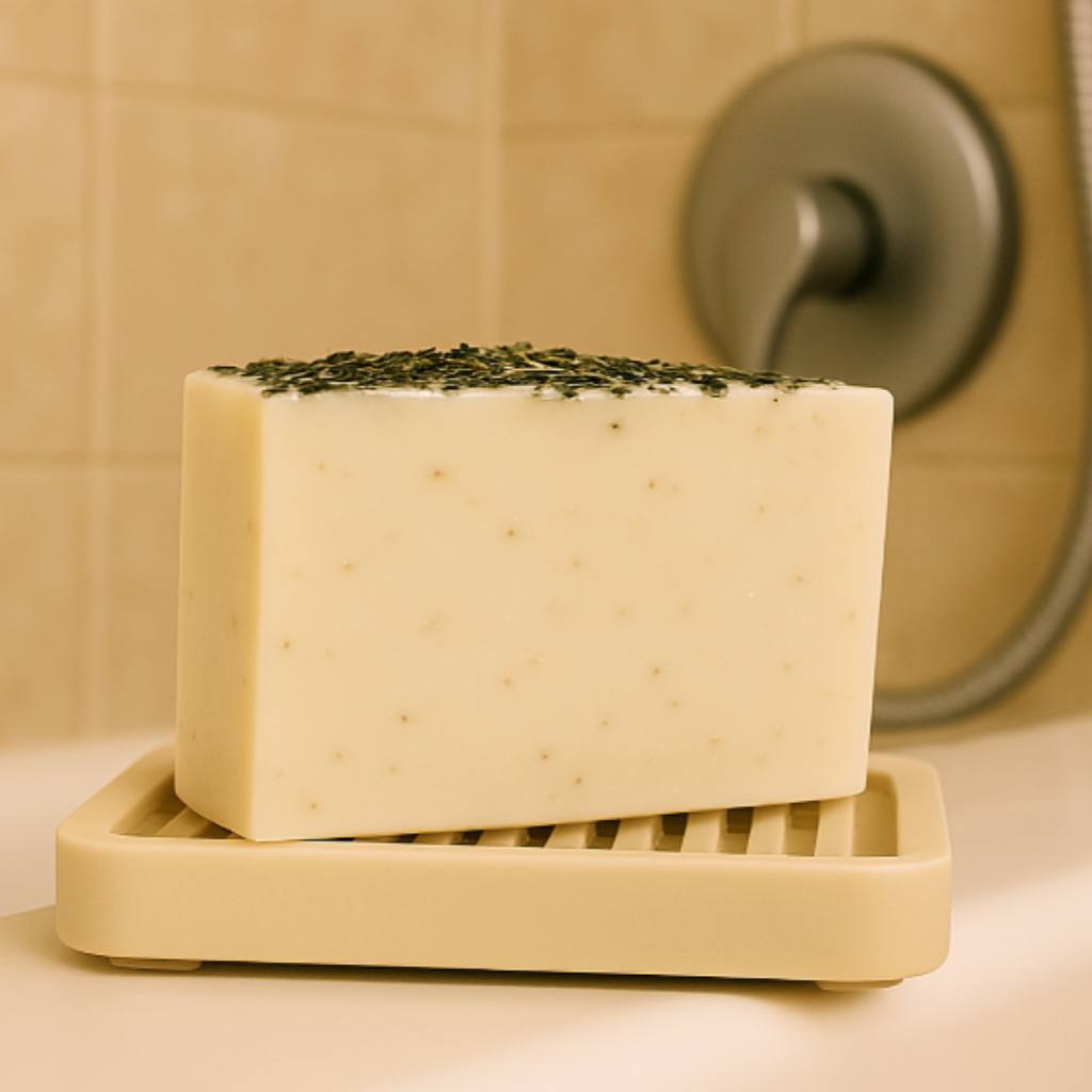 Ingredients: Saponified organic oils (olive, coconut, flaxseed, shea), fresh goats milk, essential oils (spearmint, rosemary, pennyroyal), organic ground spearmint, organic ground peppermint